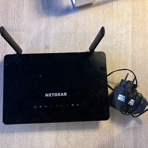Netgear AC750 R6020 router i svart utförande. Trådlös WiFi‑router med två externa antenner. På undersidan finns modellbeteckning och serienummer. Medföljer strömadapter och nätverkskabel enligt bilderna. Lämplig som hemmarouter eller för mindre kontor där trådlös och trådbunden nätverksanslutning behövs.