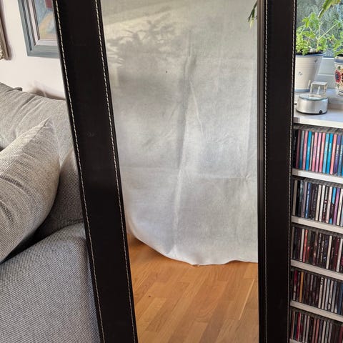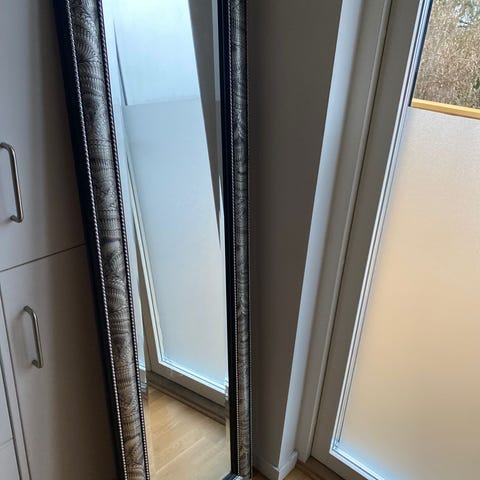 Helkroppsspegel med dekorativ guldfärgad ram och svart kant. Ramen har ett mönstrat utförande med profilerad kant runt spegelglaset. Spegeln är rektangulär med fasade hörn upptill och kan användas som golvspegel eller väggspegel i till exempel hall, sovrum eller vardagsrum.