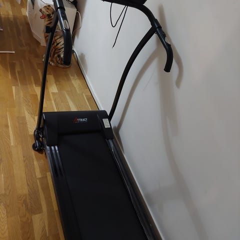 Löpbandsmaskin Attract Indoor Walking i svart färg. Utrustad med handtag. Passar för inomhusträning som gång och löpning i hemmet. Maskinen har en hopfällbar konstruktion med hjul som underlättar förvaring när den inte används. Nyligen smord. Hämtas i Östra Linero.