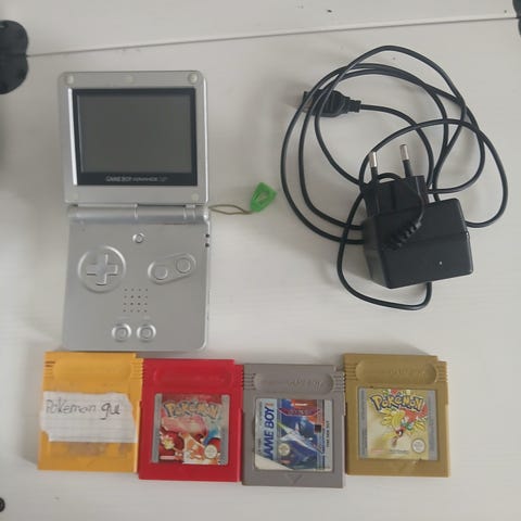 Nintendo Game Boy Advance SP- silverfärg. konsol, originalkartong, laddare, spel i originalkartong.
