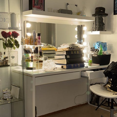 IKEA skrivbord med två utdragbara lådor. Bordsskiva i vit färg med genomföringshål för kablar i ena hörnet. Lådorna ger förvaring för till exempel kontorsmaterial, smink eller andra småsaker. Passar som arbetsplats, sminkbord eller avlastningsyta i sovrum eller vardagsrum. Viss slitage och märken finns på bordsskivan enligt bilderna.