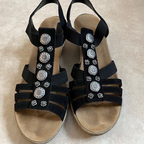 Helt oanvända sandaler i storlek 41 av märket Rieker. Modellen har svarta remmar över foten och runt ankeln med kardborreknäppning. Sulan är lätt upphöjd med kilklack och har ett flätat mönster på sidan. Innersulan är mjuk för ökad komfort. Pris 500kr. OBS! Skickas inte