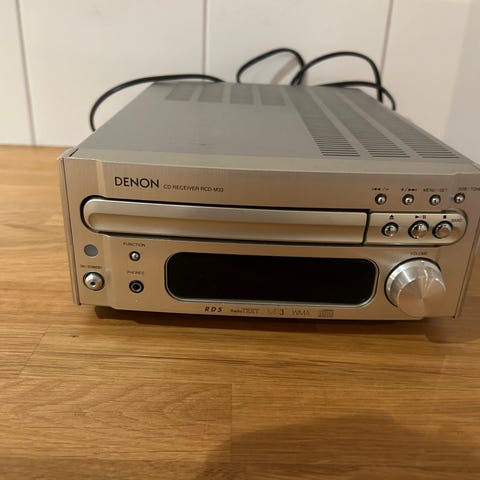 Denon RCD-M33 cd-receiver i silver. Kompakt stereoreceiver med inbyggd cd-spelare och radio. På bilderna syns huvudenheten tillsammans med separata högtalare samt bruksanvisning. Enheten har frontmonterade reglage för volym, uppspelning och funktionsval. Lämplig som stereosystem för hemmabruk, till exempel i vardagsrum, kök eller sovrum. Specificerad för uppspelning av cd-skivor och radio, med anslutningar för högtalare på baksidan.