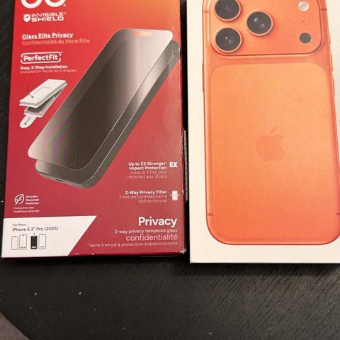 Apple iPhone 17 Pro Max smartphone med 256 GB lagringsutrymme. Modellen på bilderna är i en orange färg och levereras i originalförpackning. Telefonen har trippelkamera på baksidan och är avsedd för allmän användning som samtal, meddelanden, surf, appar, foto och video. Lagringskapaciteten på 256 GB ger utrymme för appar, bilder, filmer och dokument. Enheten är designad för användning med iOS och Apples ekosystem av tjänster och tillbehör.