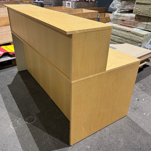 Receptiondisk med tillhörande förvaringsskåp i mörkgrå baktill. Disken har en rak front och ovansida som fungerar som arbetsyta eller mottagningsyta. Bakom disken finns skåpsmoduler med luckor och lådor för förvaring av kontorsmaterial eller dokument. Konstruktionen består av släta paneler och en separat väggdel som avskärmar receptionsytan mot kontoret. Passar för kontor, mottagning eller liknande miljöer där en fast receptionslösning behövs.