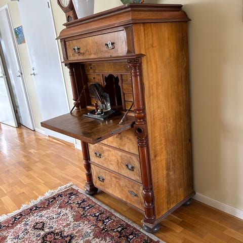 Sekretär byrå i trä i brun nyans. Möbeln har en övre sektion som kan fällas ner till skrivyta och avslöjar flera små lådor och fack för förvaring. Nedre delen består av flera större lådor för klädförvaring eller annan förvaring. Passar i vardagsrum, sovrum eller arbetsrum som kombinerad förvaringsmöbel och skrivplats.