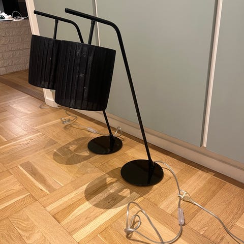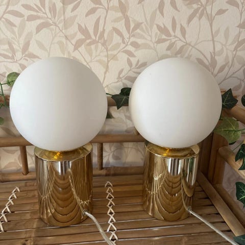 Säljer två eleganta och moderna bordslampor i glas och metall. Lamporna har en mjukt rundad glaskupa med frostad innerdel som ger ett behagligt, varmt och stämningsfullt ljus. Perfekta som sänglampor, i vardagsrummet eller på en skänk för att skapa en mysig atmosfär.