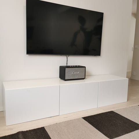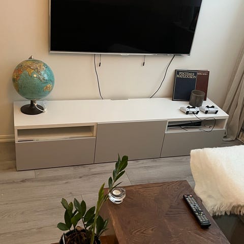 IKEA Bestå tv-bänk med en glasskiva på. Möbeln har tre luckor framtill och är 180 cm bred, 42 cm djup och 38 cm hög. Tv bänken är i fint skick, har suttit vägghängd i tidigare bostad men säljer nu pga köpt en annan TV-bänk.