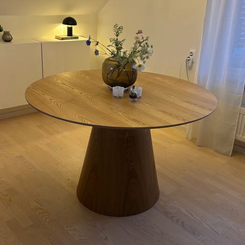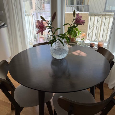Runt vitt matbord med fyra stolar från Mio. Inköpt 2019 men väldigt lite använt. Bordets diameter är 110 cm och höjden är 74 cm.
