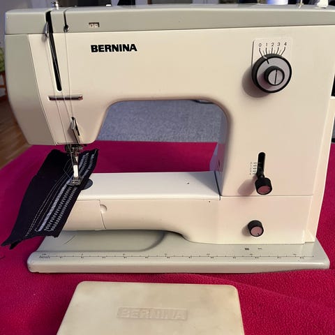 Bernina 1120 symaskin i vit färg. Mekanisk modell med flera olika sömmar och inställningar som visas på frontpanelen, inklusive raksöm, sicksack och dekorativa sömmar. Maskinen har friarm och avtagbart tillbehörsfack. Fotpedal och flera pressarfötter/tillbehör ingår enligt bilderna. Lämplig för sömnad av kläder, hemtextilier och enklare lagningar.ny servad fungerar jättebra med alla tillbehör