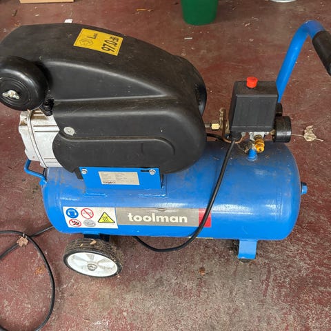 KGK bensindriven kompressor i mobil utförande med handtag och hjul för enklare förflyttning. Kompressorn har tvåcylindrig pump, manometer och lufttank monterad horisontellt. Färg blå. Lämplig för tryckluftsverktyg och andra arbeten där portabel komprimerad luft behövs.