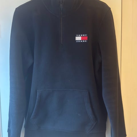 Mörkblå tröja med dragkedja i halsen. Tröjan har broderade logotyper på bröstet, inklusive Mercedes-Benz stjärnan, "AMG PETRONAS MOTORSPORT" och Tommy Hilfigers flagglogga. Halsen är ribbad och ärmsluten samt nederkanten har en ribbad mudd. Fint skick men liten fläck bak på ryggen/nacken, se sista bild. Storlek M