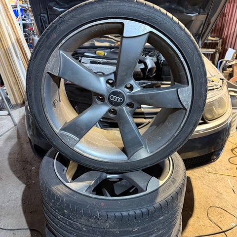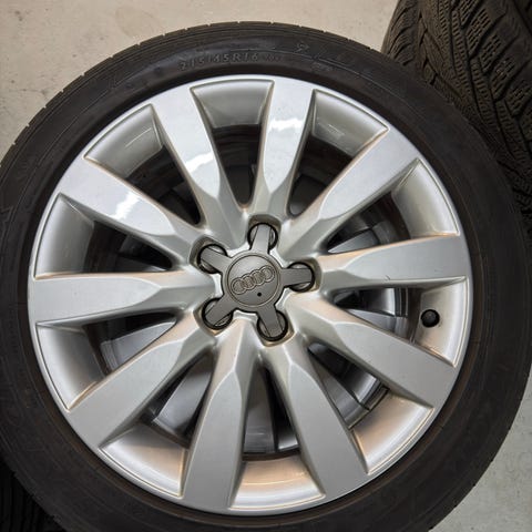Lättmetallfälgar med femdubbel ekrad design och Audi-navkapsel. Sommardäck monterade på.