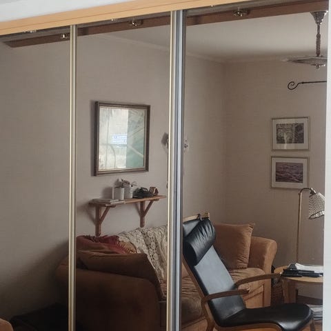 Fin gammal spegeldörr på robust skena med komplett upphängning. Enkel installation.