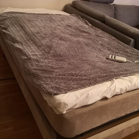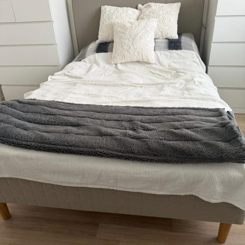 IKEA säng med grå sänggavel.