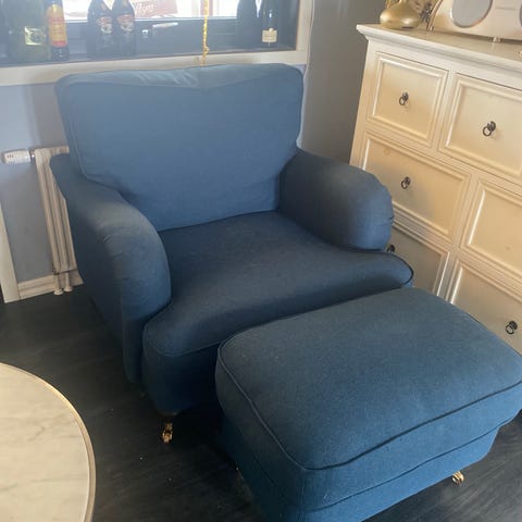 Jättefin och skön fåtölj säljes endast pga flytt. Likadant exemplar sålt för 5800 hos Stockholms Auktionsverk, enligt bild. FÅTÖLJ, Howardmodell, stoppad stomme med dunfyllda plymåer, ben i betsad bok, främre paret med hjultrissor, klädsel i toile du jouy,1900-/2000-tal, höjd ca 80, sitthöjd 45 cm, medföljer fotpall i samma klädsel.
