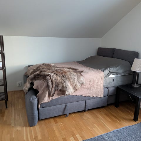 Rejäl säng med två enkla resårbottnar men dubbel madrass samt tempurmadrass.
