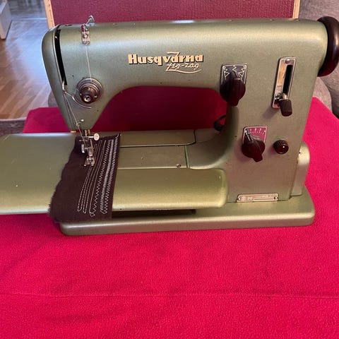Husqvarna Type 21E symaskin i grön metall. Mekanisk modell med flera sömstyper, inklusive raksöm och olika sicksackmönster, som visas på provtyget. Maskinen drivs med 220V, har 80W motor och 15W lampa enligt märkplåt. Fotpedal och tillbehör som spolar, nålar och små verktyg kan ingå enligt bild. Passar för allmän sömnad och enklare textilarbeten i hemmet. En mycket kraftfull symaskin som klarar av att sy tjockare tyger.