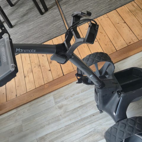 Elektrisk trehjulig scooter i svart färg. Modellen har ett brett fotstöd, sadel med fjädring och tre stora hjul med breda däck. Tror den är till för att ha på golfbanan, det finns plats för golfbagen där bak.