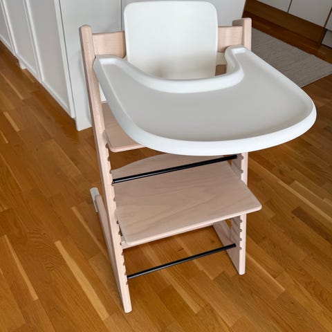 Stokke Tripp Trapp med tillhörande babyset och bricka. Absolut toppskick utan anmärkningar. Finns att hämta i Bandhagen.