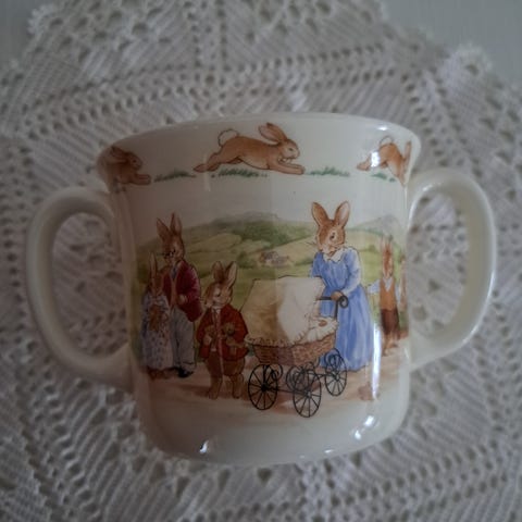 Royal Doulton barnservis bestående av mugg med två handtag och skål. Servisen är i ljust porslin med tryckt motiv av Nalle Puh och text runt kanten. Passar som barnservis för mat och dryck. Märkning under delarna visar "Winnie the Pooh" och tillverkare Royal Doulton, © Disney.