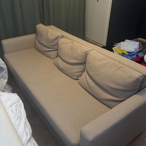 Enkel soffa som kan vikas ut och användas som säng. Bra skick, några mindre skavanker. Ta med när hjälp. Hund finns i hemmet.