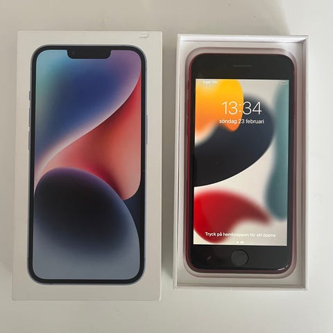 Apple iPhone SE mobiltelefon. Modellen tillhör andra eller tredje generationen av iPhone SE-serien. En kompakt smartphone med pekskärm och Touch ID-hemknapp på framsidan. Levereras i originalförpackning enligt bilderna, med information och märkning på baksidan av kartongen. Lämplig för vardaglig användning som samtal, meddelanden, appar, surf och mediauppspelning.