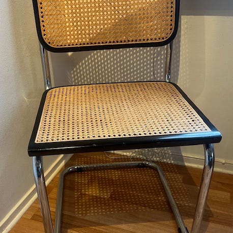 Marcel Breuer designade sin Cesca-stol redan 1928 och den har aldrig blivit omodern. Sitsarna på dessa har fått ny fransk rotting av hög kvalitet monterad. Rottingen i ryggstöden är hel och är fint patinerad.