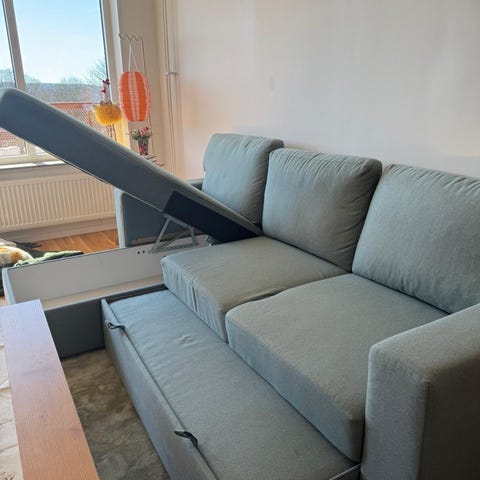 Grå divansoffa, nytvättat och i fint skick. Tyvärr en fläck som blivit pga öppet fönster. Går säkert att få bort, ej testat själv.