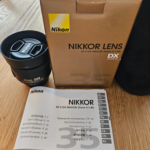 Orginalkartong, motljusskydd, filter och objektivpåse följer också med.