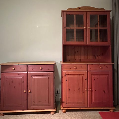 Sideboard i trä med två lådor av svenska tillverkaren Åmells Möbler. Möbeln är målad i grön färg och har profilerade luckor och sidor samt dekorativa metallhandtag. Passar för förvaring i exempelvis vardagsrum, hall eller kök, med plats för porslin, textilier eller andra hushållsartiklar i både lådor och skåpsutrymme. Nypriset med beställning är 36000kr, säljes för 3500kr eller högsta bud.