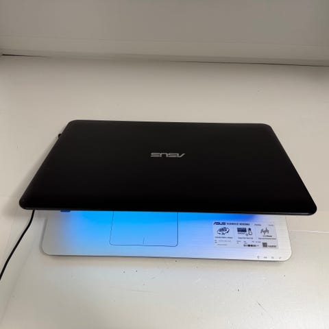 Asus laptop i svart färg. Datorn har ett fullstort tangentbord med numerisk del och en större pekplatta. Skärmen är monterad i en klassiskt. Rätt gammal dator men gör sitt jobb du behöver ett nytt batteri men funkar när laddaren är i. Det är en lång laddare