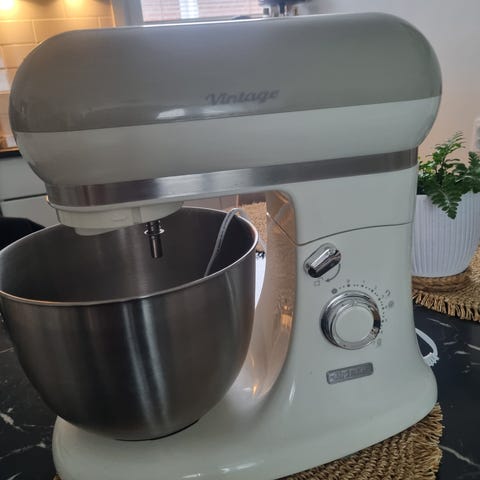 Electrolux köksmaskin med rostfri bunke. Maskinen är av bänksmodells-typ och används för blandning och vispning av ingredienser vid bakning och matlagning. Bunken är i rostfritt stål och maskinen har en överdel med infästning för tillbehör som degkrok, visp eller blandare. Passar för hushållsbruk i kök där man vill underlätta arbete med degar, smetar och andra blandningar.