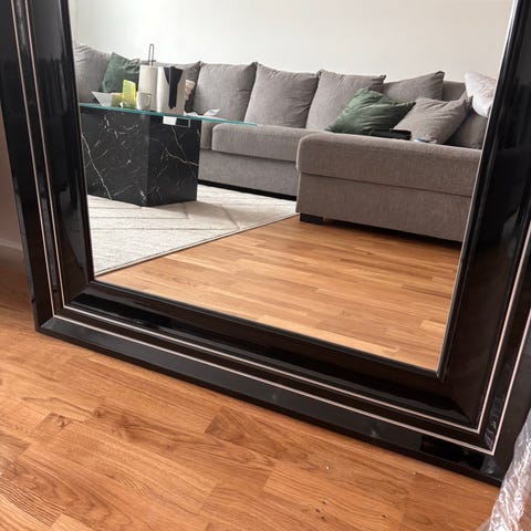 Skagerak spegel med rektangulär form och svart ram. Golvspegeln kan lutas mot vägg eller monteras enligt tillverkarens anvisningar och passar i exempelvis hall, sovrum eller vardagsrum för helkroppsspegling och rumsförstoring.