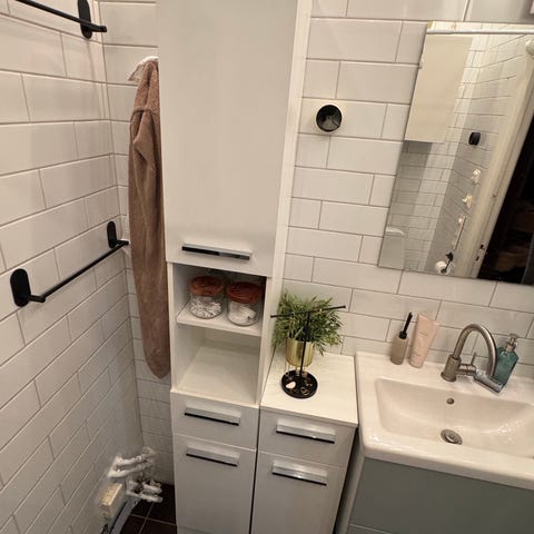 Badrumsskåp märke Camargue som säljs av Bauhaus. Storlek höjd 66cm x bredd 50cm x djup 14cm. Dubbel speglar utsida och insida. Eluttag inne i skåpet. Färg vit. Bra skick.