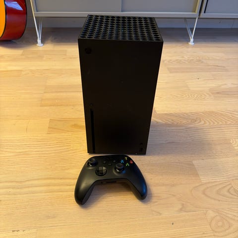 Microsoft Xbox Series X spelkonsol i svart utförande. Konsolen är avsedd för Xbox Series-spel och är anpassad för användning med tillhörande handkontroller och tillbehör för denna generation. Lämplig för uppspelning av kompatibla spel, streaming och annan underhållning som stöds av Xbox Series X-plattformen.