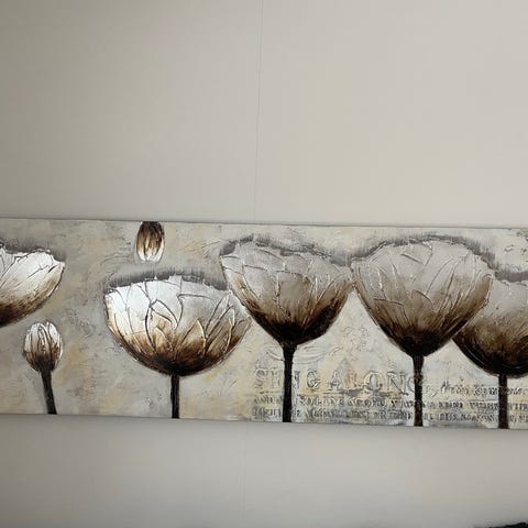 Mio tavla med blommotiv i neutrala toner. Rektangulär målning med stora, stiliserade blommor i vitt och beige mot ljus bakgrund. Passar som väggdekoration i exempelvis vardagsrum, sovrum eller hall. Tavlan är avlång och gör sig bra ovanför soffa, säng eller sideboard.