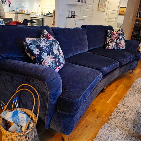 Mönstrad howardsoffa med felfri men något blekt klädsel som är avtagbar. Tyg på båda sidor.