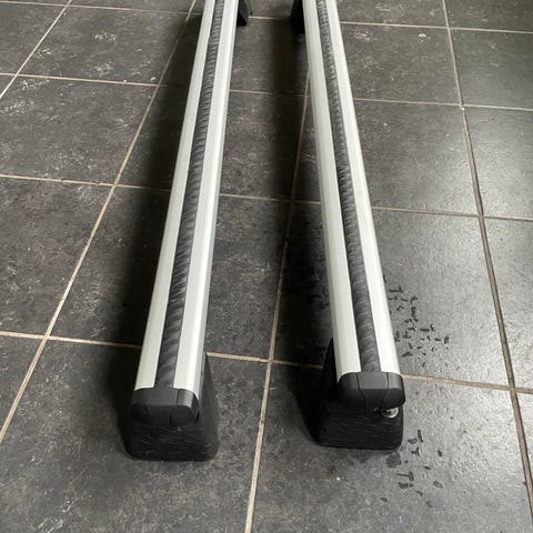 1500 :- 1 st. Volvo takräcken i aluminium. Två tvärbalkar med låsbara fästen. Passar Volvo XC 60 för denna typ av originalfästen. Takräckena har aluminiumprofiler med plastklädda fötter märkta Volvo. Lämpliga som bas för montering av exempelvis takbox.