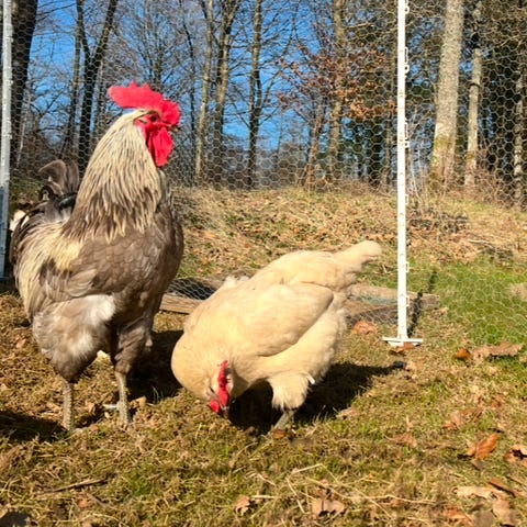 Blandade höns och kycklingar i olika färger. Bilderna visar vuxna höns och tuppar i bland annat vita, svarta och ljusa färgvarianter samt en ljus kyckling. Lämpliga som hobbyhöns eller för äggproduktion i mindre besättningar.