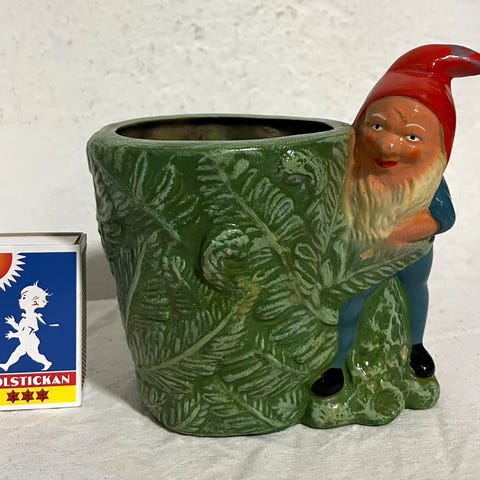 IKEA Vinterfint tomteskål med skidor. Passar som prydnad under julen på bord, hylla eller fönsterbräda. Tillverkad i hårt material med blank yta och rundad form med små fötter och armar.