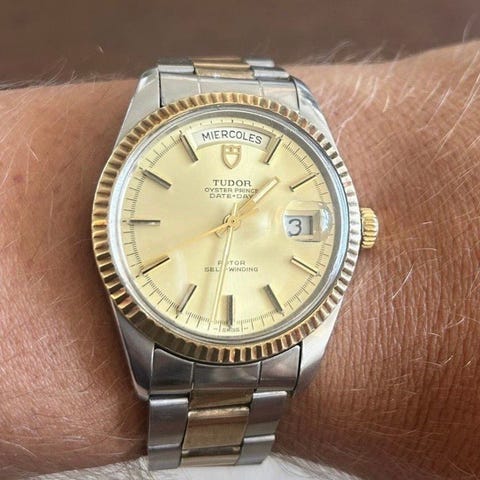 Tudor day date vit urtavla med datum och dag, romerska siffror. Slutet av den generation där Rolex tillverkade delarna till klockorna. Ett riktigt kap med andra ord.