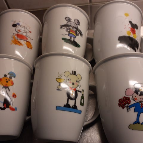 Stavangerflint mugg i keramik/flammgods i vit färg med tryckt figurmotiv av människa och apa på utsidan. Muggen har rund form med rejält handtag och slät insida. Märkt Stavangerflint Norway med modellbeteckning 3087-525 på undersidan. Passar för servering av varma och kalla drycker.