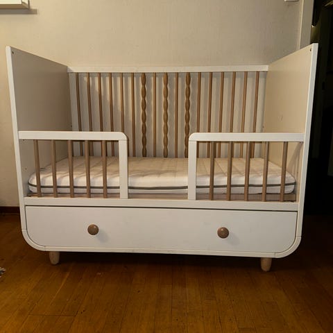 Sängen har, som syns på bilden, en avtagbar långsida vilket passar äldre barn. Långsidan som vi har tagit bort följer med och kan enkelt monteras tillbaks.