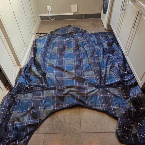Ett utetäcke 200 g. Ett fleecetäcke, mörkblått.