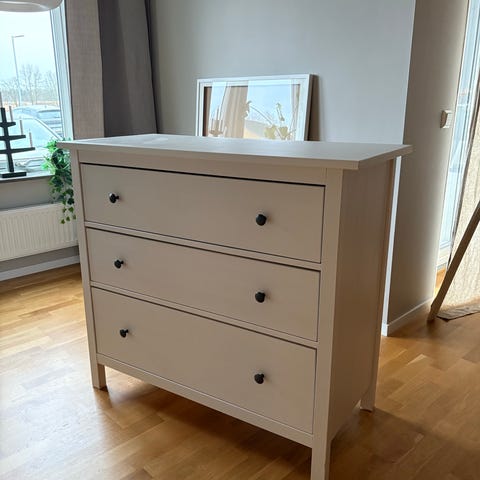 Byrån är stabil, välbyggd och i fint skick. Lådorna är djupa och glider lätt – perfekt för kläder, sängkläder eller annan förvaring.