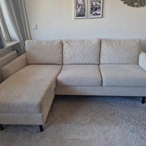 Använd i ca 3 månader. Mysig soffa, lätt att förvandla till en säng om man har en sovande gäst. Ljusrosa, perfekt till en mindre lägenhet. Rymmer 3/4 pers. Säljer pga flytt, inget fel på den.