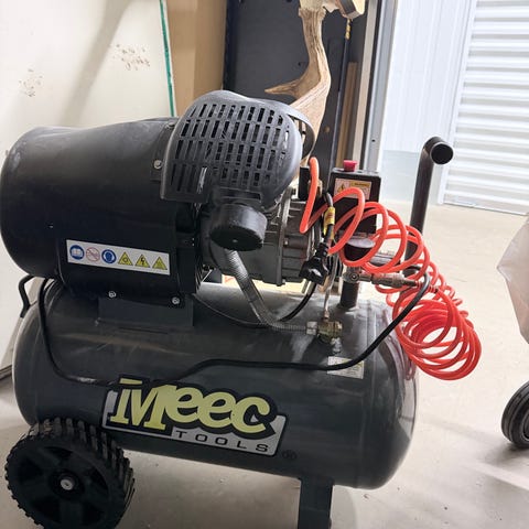 Hamron kompressor med tryckluftsverktyg och slangar röd
