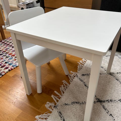 Setet består av ett rektangulärt bord och fyra matchande stolar i mindre storlek anpassat för barn. Passar exempelvis i barnrum, lekrum eller som pyssel- och matplats för barn.