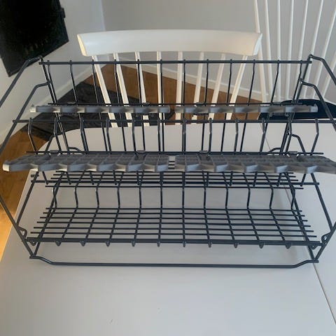 Flaskställ i metall med vågformade hållare. Avsett för förvaring av flaskor liggande, exempelvis i skåp, hylla eller skafferi. Öppen konstruktion som gör flaskorna lättåtkomliga och ger överblick över innehållet. Passar för standardstorlek på flaskor beroende på hur det monteras eller placeras.Finns i Malmö.Kan lämnas I Sjöbo.30.5 cm lång och 19 cm bred.